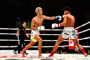 2R、セコンドの指示通りのらりくらりと動きつつも、ジャブや右ストレートを的確にヒットさせて いくACHI。 ワンキャッチからのヒザを叩き込み、北井をダウン寸前まで追い込むが、北井も前へ出て右スト レート、左フックを当てに行った。